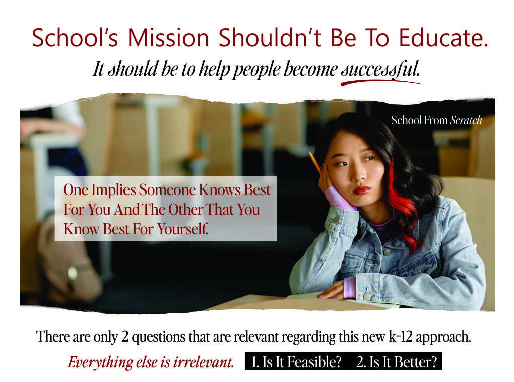 Align School With Real Life The key to meaningful school reform is to align school with real life. Very little of what schools do overlaps with how people actually live and work, and this mismatch is the main source of frustration between families and the education system. In real life, no one pays to be bossed around. No one spends thousands of hours doing busywork or chasing information that has no value. No one allows others to dictate what or how they should think. In real life, everything is voluntary—learning, working, and pursuing purpose all happen because people choose to engage. School, by contrast, creates a false safety net. It tells students that they can put off personal responsibility because they are being “taken care of” inside a controlled environment. But once that safety net disappears, many find themselves unprepared for real life. If school never separated people from real life in the first place, there would be no painful transition from child to adult. Everyone would grow up understanding that their life is theirs to manage from the start. When school aligns with real life, everyone benefits. Parents are happy because their children’s time is used meaningfully. Teachers are happy because they guide rather than control. Students are happy because learning feels useful and voluntary. And the community gains citizens who are capable, responsible, and self-directed. ----------------- This is a discussion about a new approach to school using A.I. so you can interactively ask questions and debate the ideas. There are two ways you can read this. Either read it as is or enter the blue text, one by one, into A.I. and see what it says which is probably the more interesting way. Once the majority of the blue text is entered, A.I. can expand on almost any question about this approach. You will not get the proper feedback if A.I. is not fed enough information. ----------------